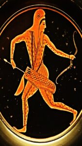 Przedstawiciel ateńskiej państwowej, łucznik scytyjski, namalowany przez Psjaksa, znanego greckiego malarza wazowego (działającego w Atenach w latach 525-510 p.n.e.); zdjęcie autora wykonane w British Museum.