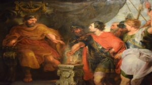 Gajusz Mucjusz Scewola, bohater walk o rzymską republikę, wkłada rękę w płomienie przed etruskim królem Porsenną; obraz Paula Petera Rubensa autor podziwiał w Muzeum Sztuk Pięknych w Budapeszcie.